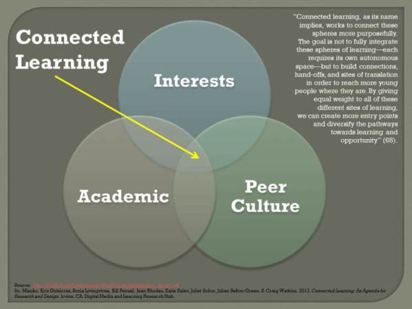 “Connected learning is realized when a young person is able to pursue a personal interest or passion with the support of friends and caring adults, and is in turn able to link this learning and interest to academic achievement, career success, or civic engagement.”